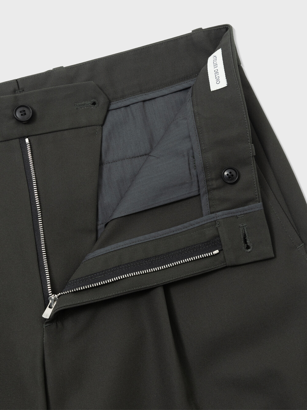 테일러드 팬츠 전문 공방에서 원맨 메이드로 만들었습니다. YKK 일본 본사의 장인들이 수작업한 프리미엄 엑셀라(Excella) 금속지퍼를 달고, 천연 소뿔단추를 사용하였습니다. 강연 원단의 깔끔하게 떨어지는 실루엣을 유지하기 위해 워싱을 생략하였습니다.