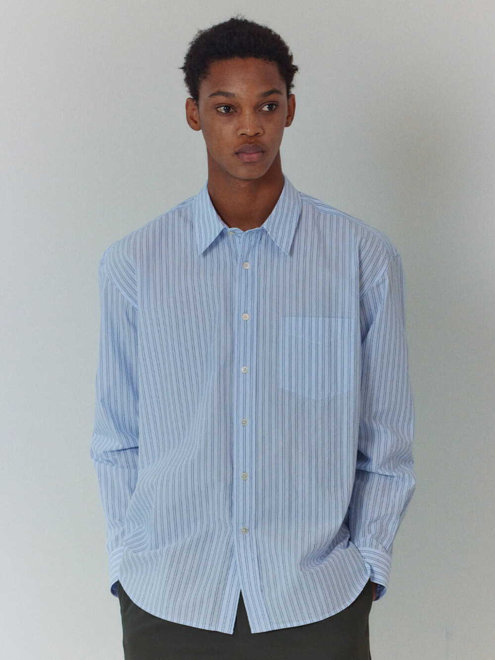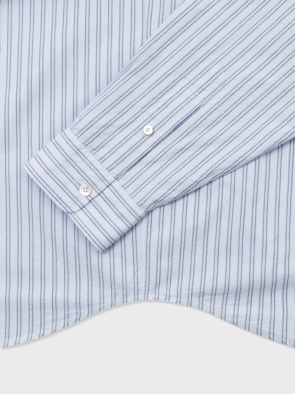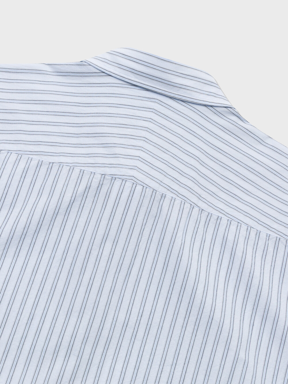 60수 타이프라이터 원단으로 만든 스트라이프 셔츠입니다. 시원한 라이트 블루 색감의 캐주얼한 스트라이프 셔츠입니다. 앞판에 플라켓과 가슴포켓이 달려있으며, 뒷판 요크를 사선으로 재단하였습니다. 적당히 여유로운 실루엣의 컴포트 핏 셔츠로 캐주얼 팬츠부터 셋업까지 다양한 아이템과 매치할 수 있습니다.