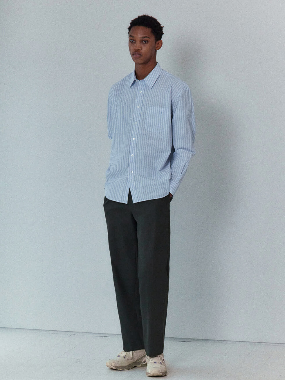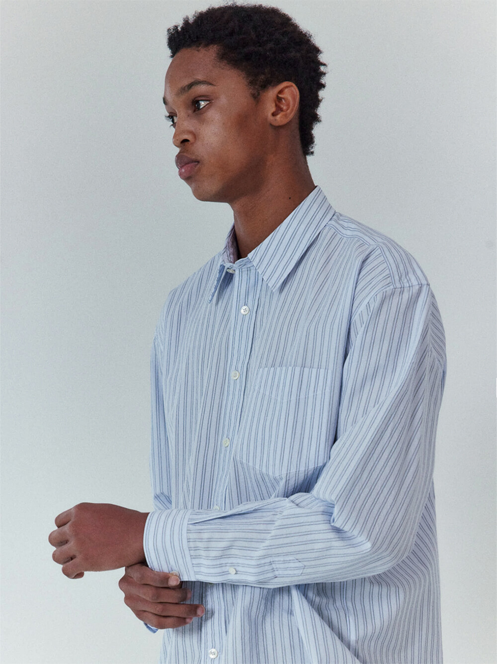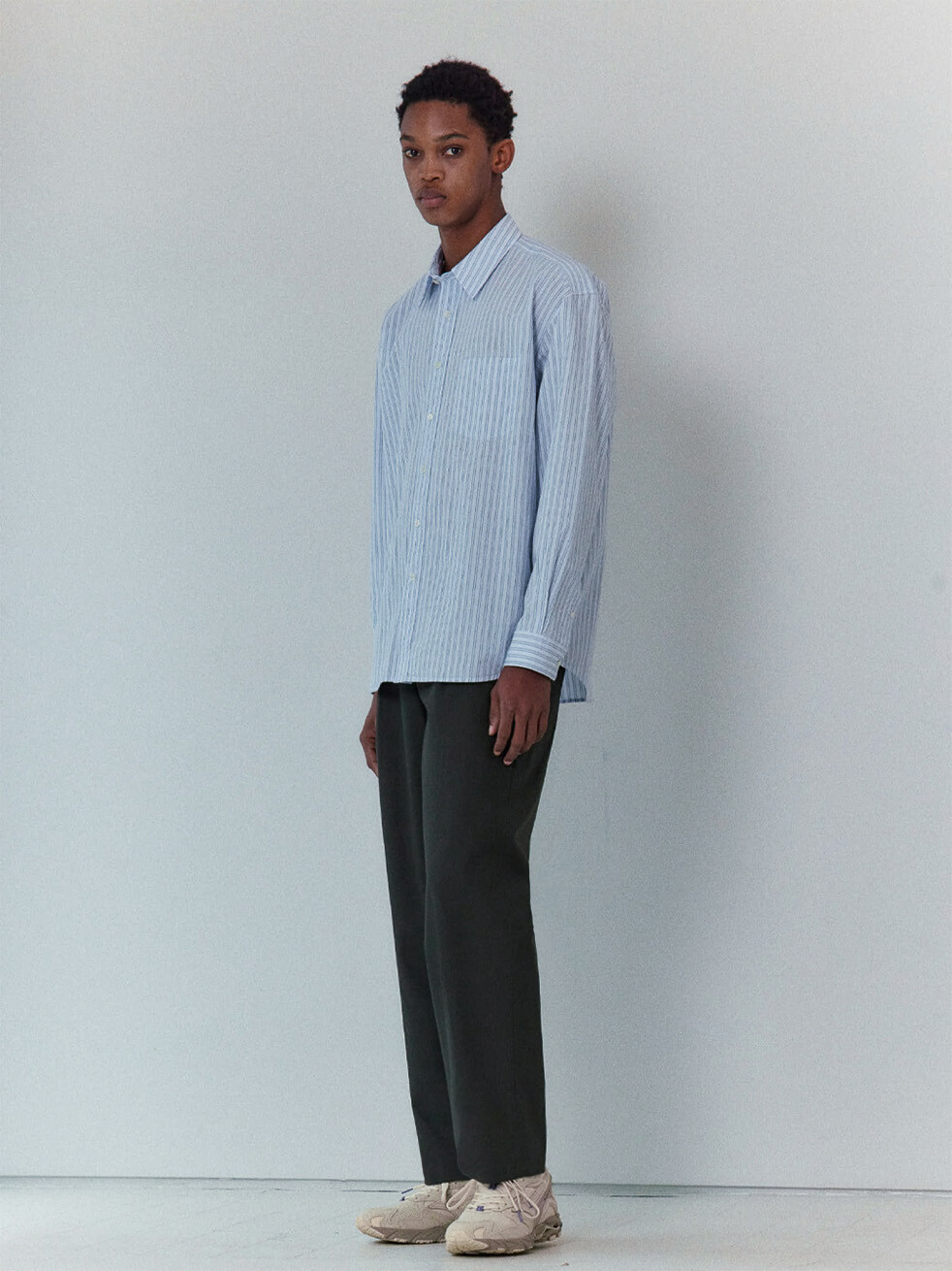 60수 타이프라이터 원단으로 만든 스트라이프 셔츠입니다. 시원한 라이트 블루 색감의 캐주얼한 스트라이프 셔츠입니다. 앞판에 플라켓과 가슴포켓이 달려있으며, 뒷판 요크를 사선으로 재단하였습니다. 적당히 여유로운 실루엣의 컴포트 핏 셔츠로 캐주얼 팬츠부터 셋업까지 다양한 아이템과 매치할 수 있습니다.