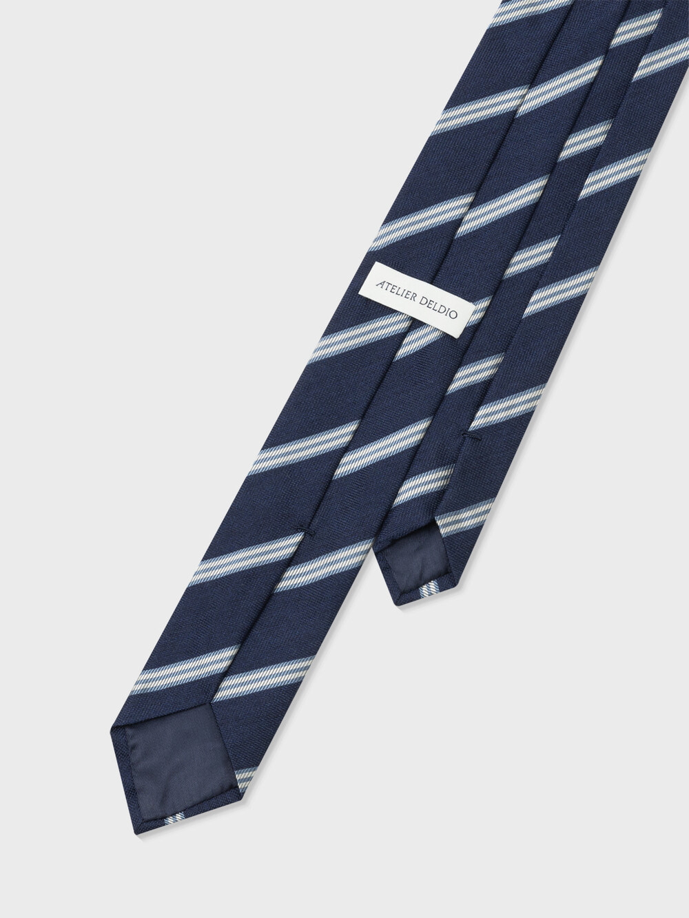 이태리 코모에 위치한 넥타이 전문 공방에서 세계적인 명품 하우스 브랜드와 동일한 패턴 및 봉제기법으로 제작하였습니다. 명품 브랜드에서 사용하는 프리미엄 심지를 적용하여 타이의 실루엣이 내츄럴하게 떨어지며, 자연스러운 매듭과 딤플(Dimple)을 만들 수 있습니다. 타이 안쪽에는 고급 타이의 상징인 조정실을 손바느질하였습니다. 대검 뒷면의 라벨은 소검을 넣는 용도로 사용할 수 있습니다.