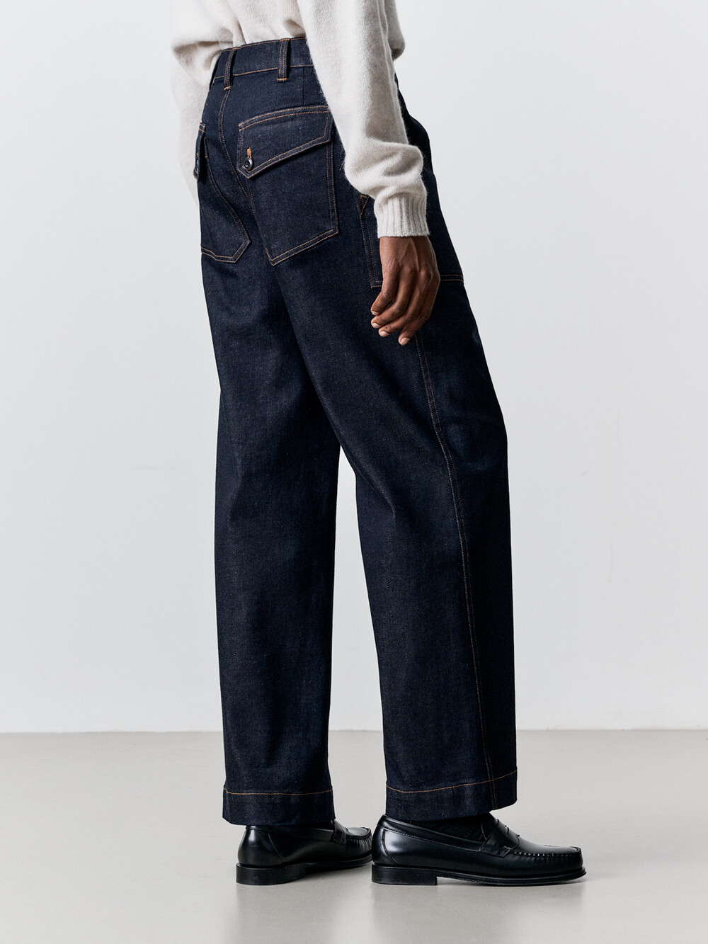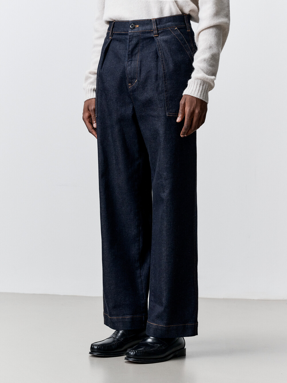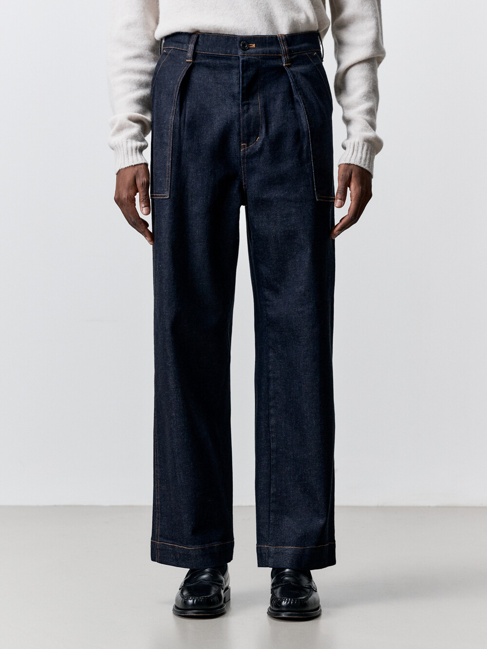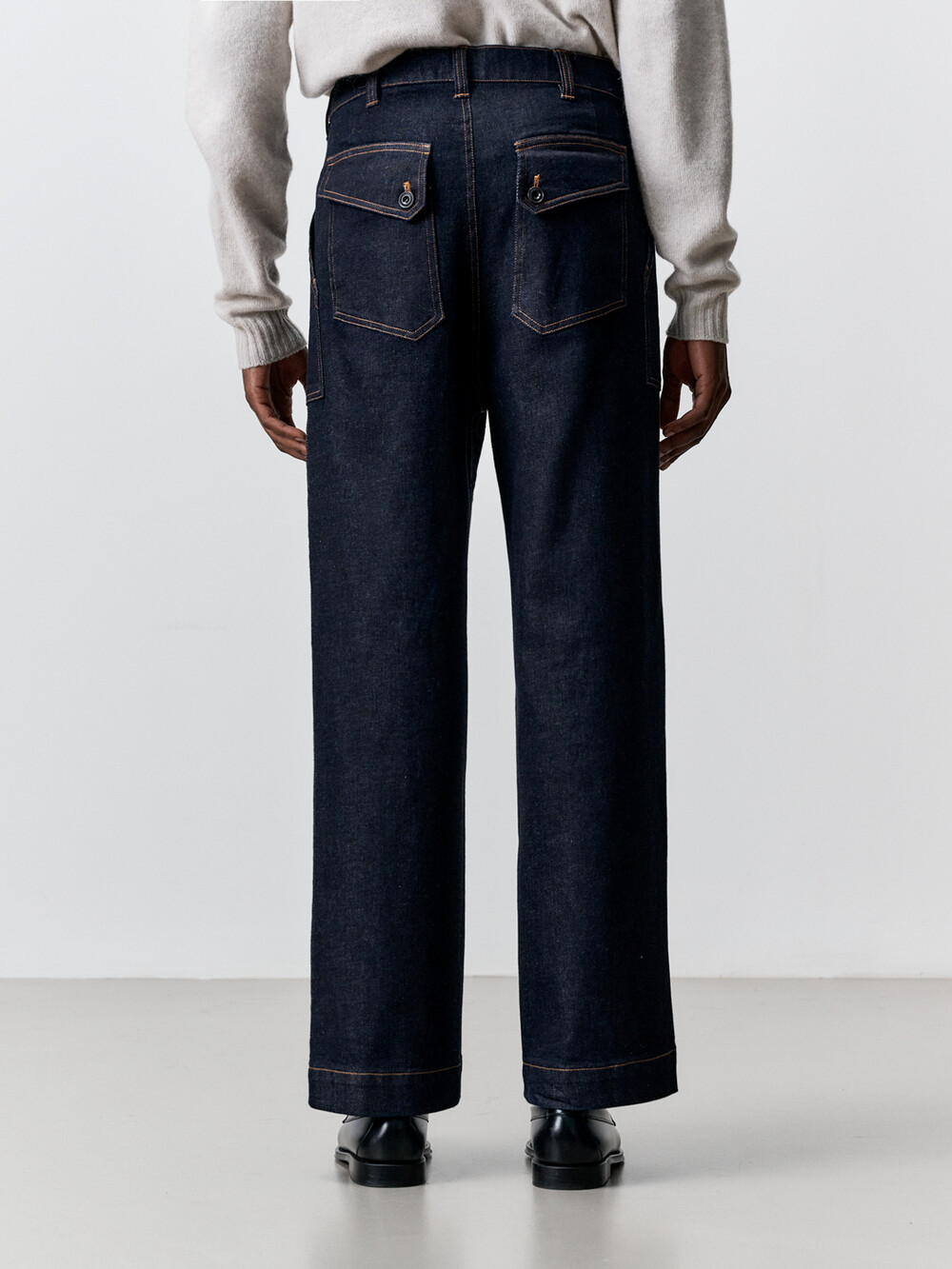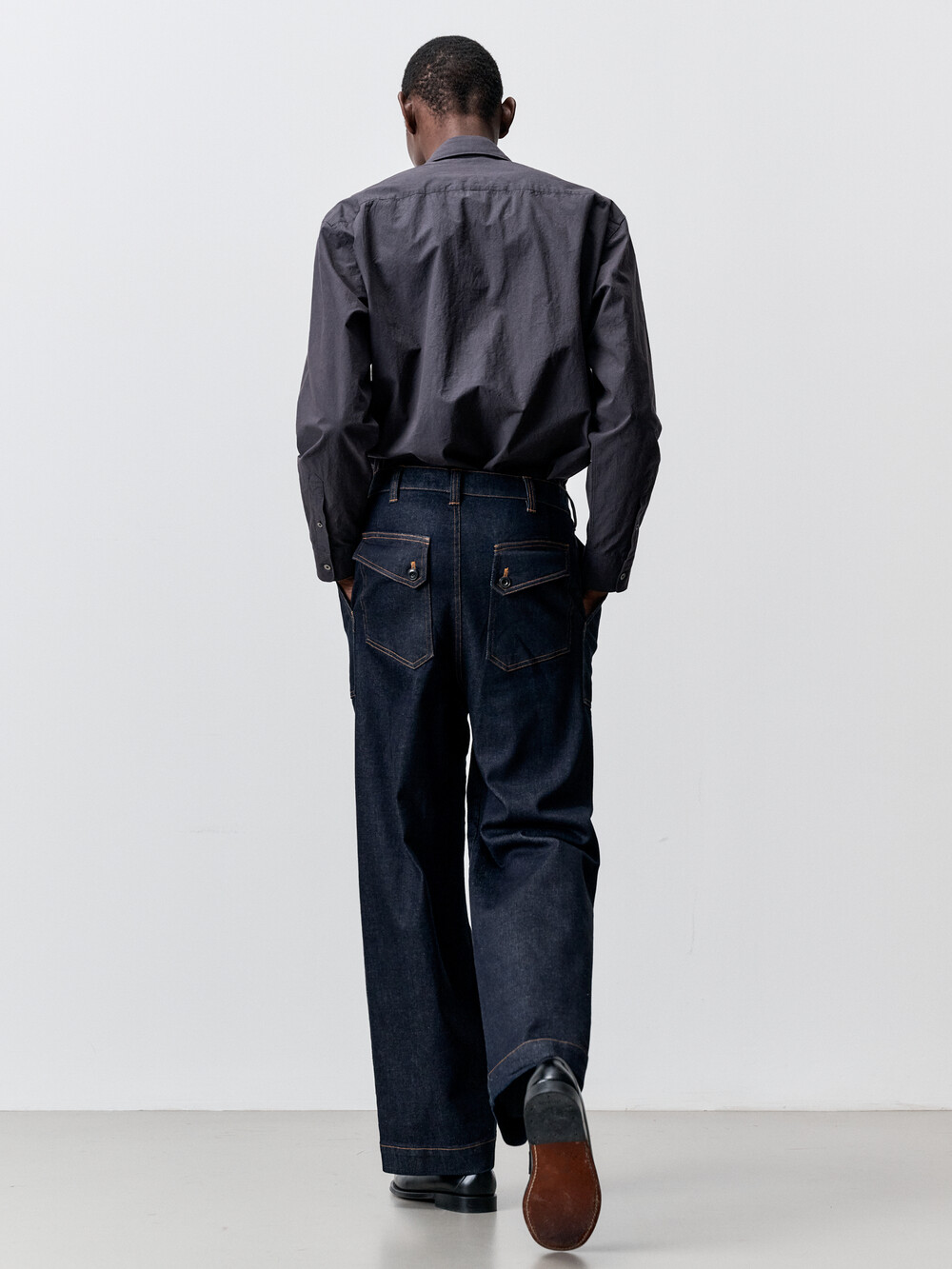 새롭게 출시되는 플리티드 퍼티그 팬츠입니다. 미 공군의 유틸리티 팬츠를 재해석한 제품으로 퍼티그 팬츠의 앞판 포켓 라인을 따라 주름이 잡혀있으며, 뒷면에는 플랩포켓이 달려있습니다. 데님 원단과 밀리터리 팬츠 디테일이 만나 캐주얼부터 비즈니스 룩까지 다양한 연출이 가능한 활용도 높은 아이템으로 동일한 원단의 데님 재킷과 셋업으로 코디 가능합니다.