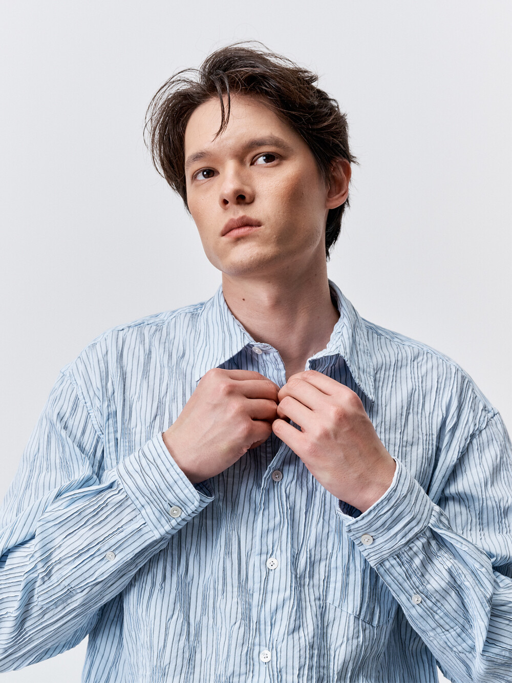 도비 스트라이프 원단으로 만든 컴포트 핏의 크리즈 셔츠입니다. 스트라이프 패턴 위의 불규칙한 주름이 매력적인 독특한 디자인의 셔츠입니다. 움직임에 따라 주름이 펴지는 신축성 원단을 사용하여 디자인과 실용성을 모두 확보하였습니다. 적당히 여유로운 실루엣의 컴포트핏 셔츠로 캐주얼 팬츠부터 셋업까지 다양한 아이템과 매치할 수 있습니다.
