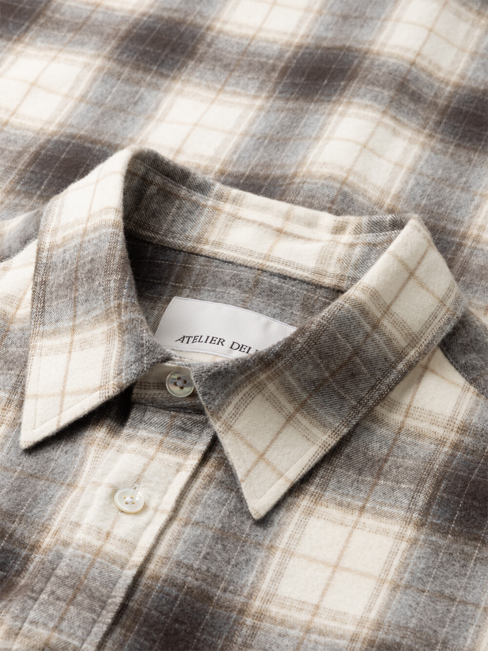 30수 2합 코튼의 바깥면을 쉐기(Shaggy) 가공하여 부드럽게 털이 올라오도록 만든 일본산 옴브레 플란넬 코튼을 사용하였습니다. 지난 시즌에 이어 새롭게 선보이는 옴브레 체크 패턴으로 과하지 않은 배색과 은은하고 고급스러운 그라데이션이 특징입니다. 아틀리에 델디오는 특유의 촉감과 색감을 위해 프리미엄 수입소재만을 고집합니다.