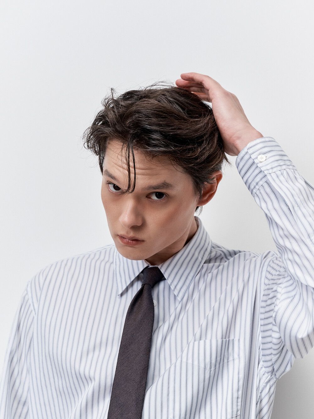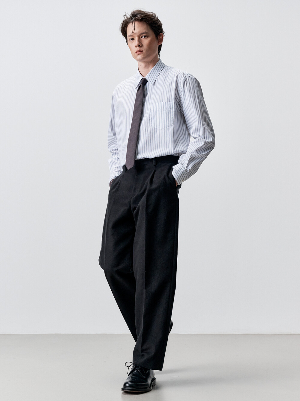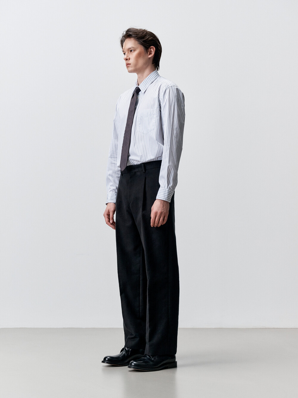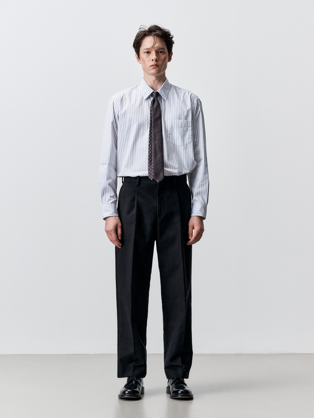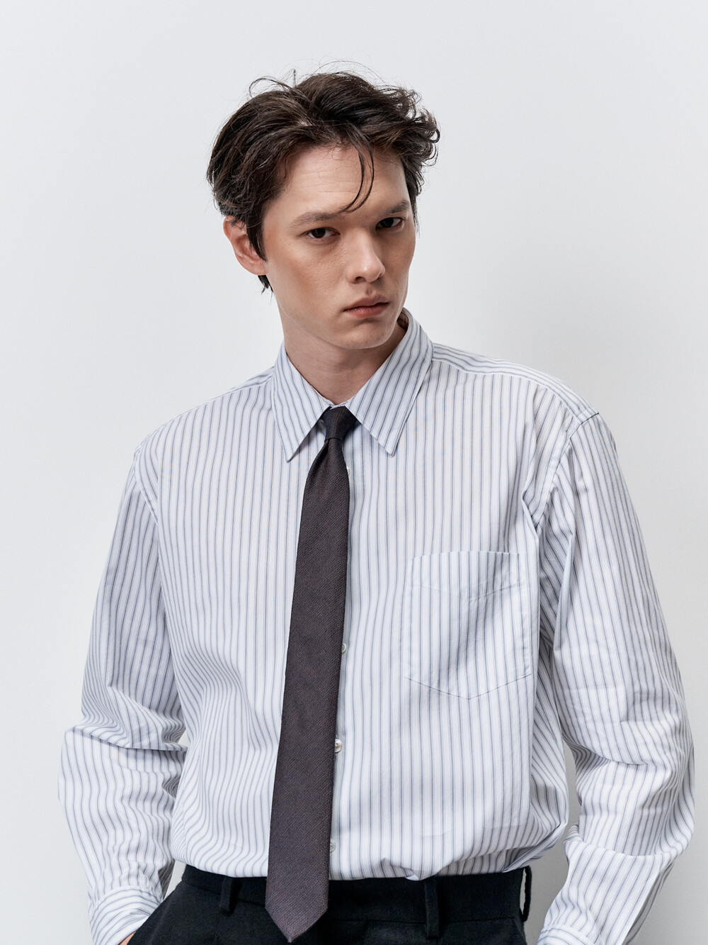 적당한 간격의 스트라이프 패턴이 매력적인 테이퍼드 셔츠입니다. 여유로운 실루엣을 살리면서도 허리라인을 조정하여 자연스럽게 넣어입을 수 있도록 만들었습니다. 미니멀하고 프로패셔널한 룩을 위하여 앞판 플라켓을 생략하고 뒷판도 주름없이 깔끔하게 디자인했습니다. 이번 시즌에는 가슴 포켓을 추가하여 실용성을 높였습니다. 캐주얼함과 포멀함을 모두 만족시키는 셔츠입니다. 타이와 매치하기에도 좋은 디자인의 셔츠로 캐주얼 룩부터 셋업 수트까지 다양한 코디가 가능합니다.