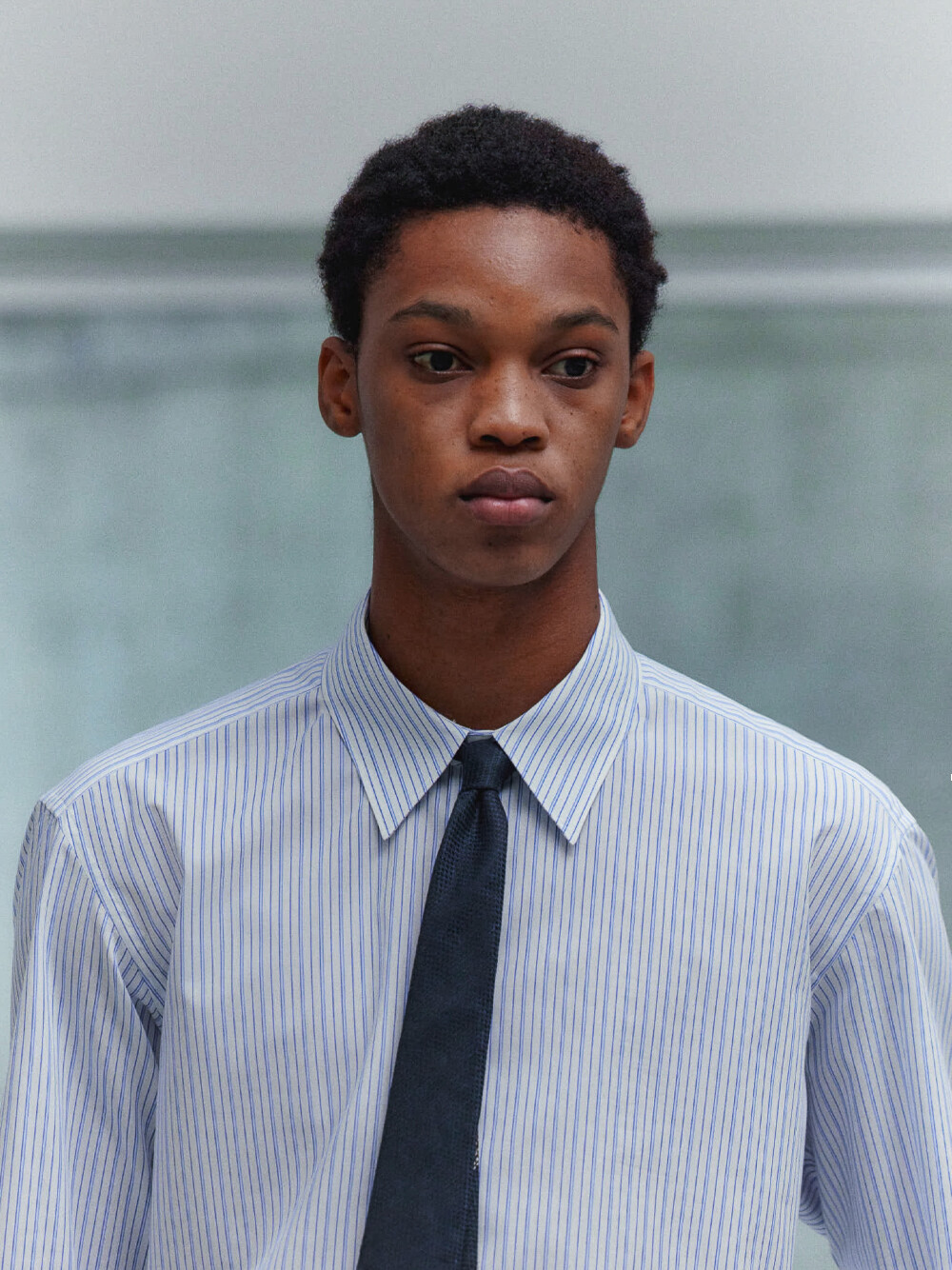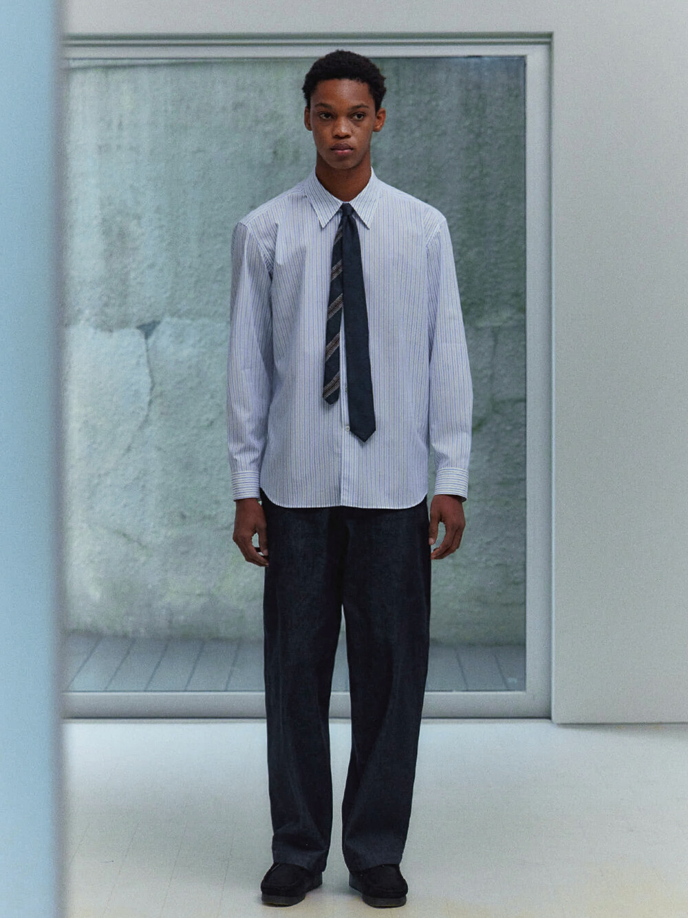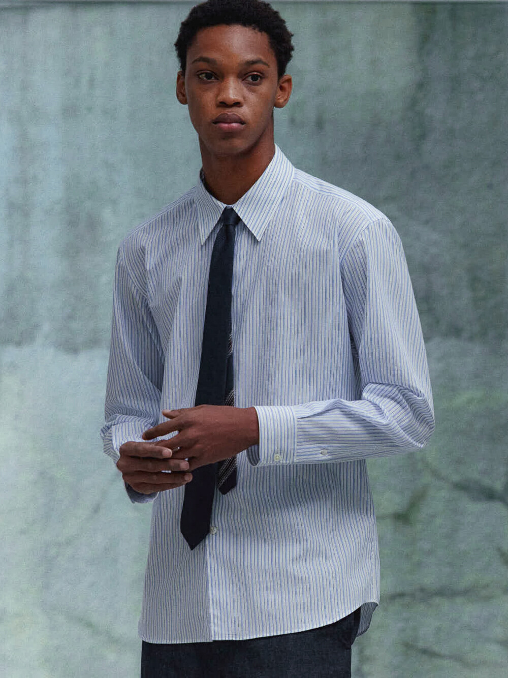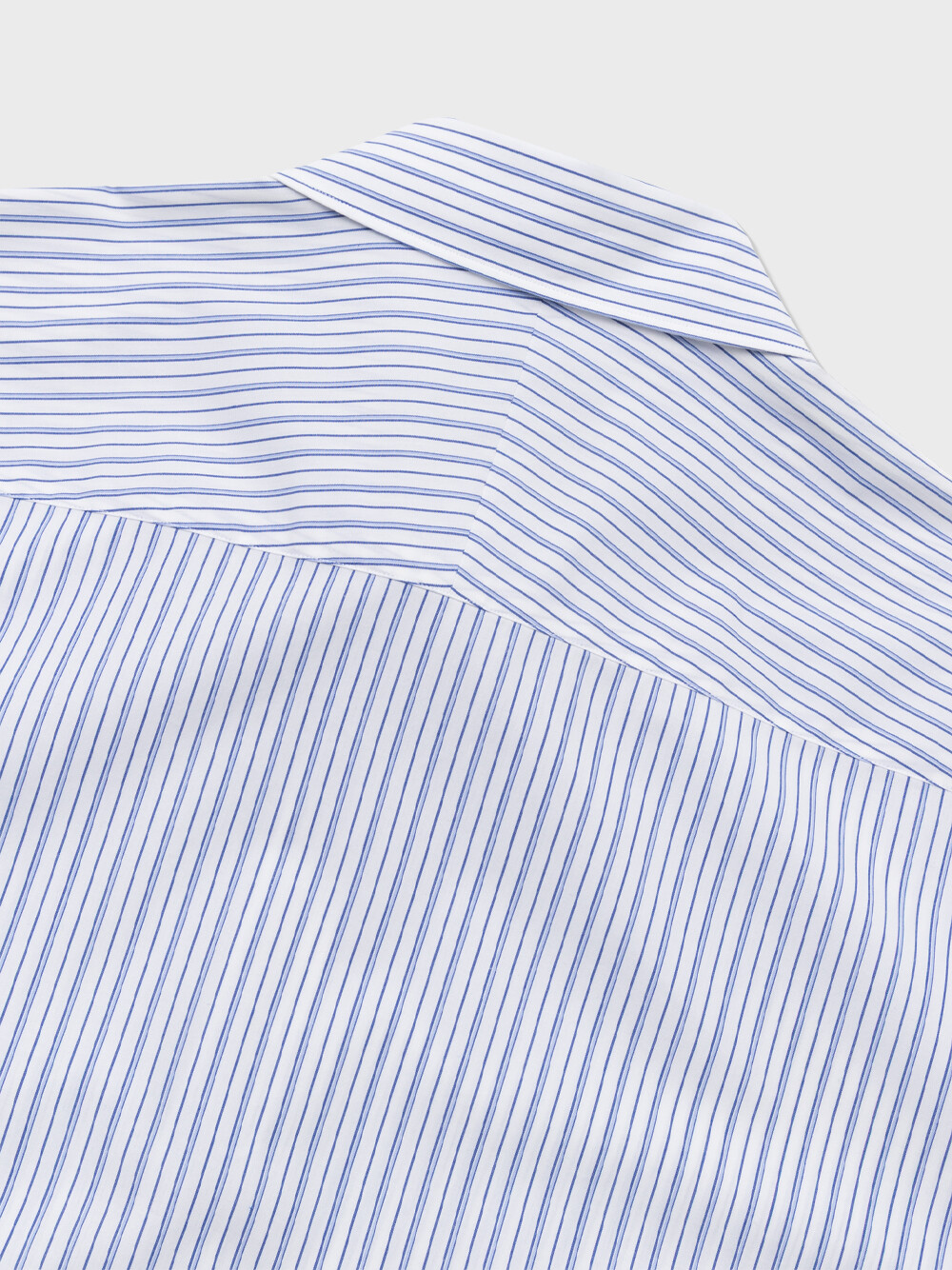 스트라이프 패턴의 오가닉 코튼 포플린 원단으로 만든 테이퍼드 셔츠입니다. 여유로운 실루엣을 살리면서도 허리라인을 조정하여 자연스럽게 넣어입을 수 있도록 만들었습니다. 미니멀하고 프로패셔널한 룩을 위하여 앞판 플라켓과 주머니를 생략하고 뒷판도 주름없이 깔끔하게 디자인했습니다. 편안함과 포멀함을 모두 만족시키는 뉴 포멀룩의 셔츠입니다. 타이와 매치하기에도 좋은 디자인의 셔츠로 슬랙스부터 셋업 수트까지 다양한 비즈니스웨어와 코디할 수 있습니다.
