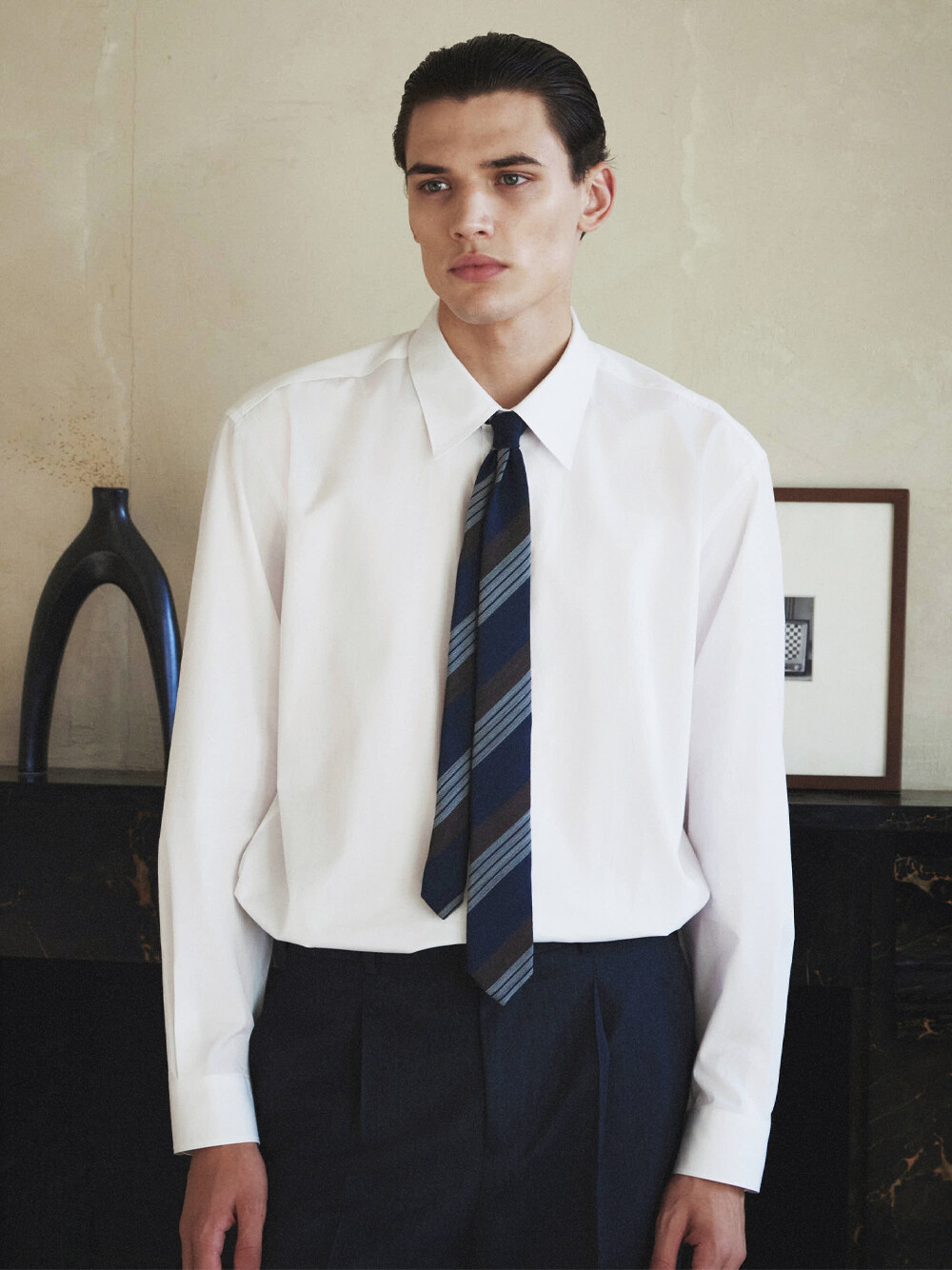 이태리 코모에 위치한 실크 전문 공장 핀토에서 만들었습니다. 세계적인 명품 브랜드와 동일한 패턴 및 봉제기법으로 제작되었습니다. 유럽의 명품 브랜드에서만 사용하는 심지를 적용하여 타이의 실루엣이 내츄럴하게 떨어지며 매듭과 딤플(Dimple)을 쉽게 잡을 수 있습니다. 타이 안쪽에는 고급 타이의 상징인 조정실을 손바느질하였습니다. 대검 뒷면의 라벨은 소검을 넣는 용도로 사용할 수 있습니다.