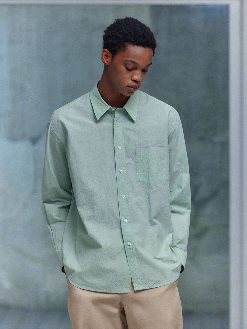 자연스러운 주름이 매력적인 캐치워셔 셔츠입니다. 기존의 패턴을 더욱 정교하게 수정하였습니다. 앞판에 플라켓과 가슴포켓이 달려있으며, 뒷판 요크를 사선으로 재단하였습니다. 적당히 여유로운 실루엣의 컴포트 핏 셔츠로 캐주얼 팬츠부터 셋업까지 다양한 아이템과 매치할 수 있습니다.