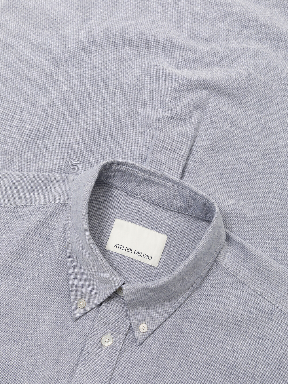 성수동에 위치한 아틀리에 델디오의 자체 공방에서 생산하였습니다. 인치당 18땀 이상의 촘촘한 봉제를 하였으며, 옥스포드 버튼다운 셔츠의 맛을 살리기 위해 셔츠 옆선과 뒷판을 트리플 스티칭(triple stitching)으로 마무리하였습니다. 내츄럴함을 살리기 위하여 카라와 소매에 비접착 심지를 사용하였습니다. 델디오의 모든 셔츠는 독일산 귀터만(Güterman) 실과 천연 자개단추를 사용합니다. 셔츠 완성 후 가먼트 워싱을 통해 수축률을 최소화하고 캐주얼함을 더했습니다.