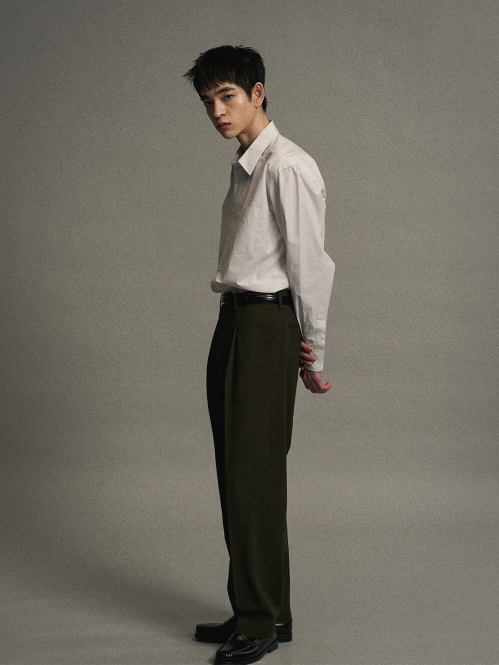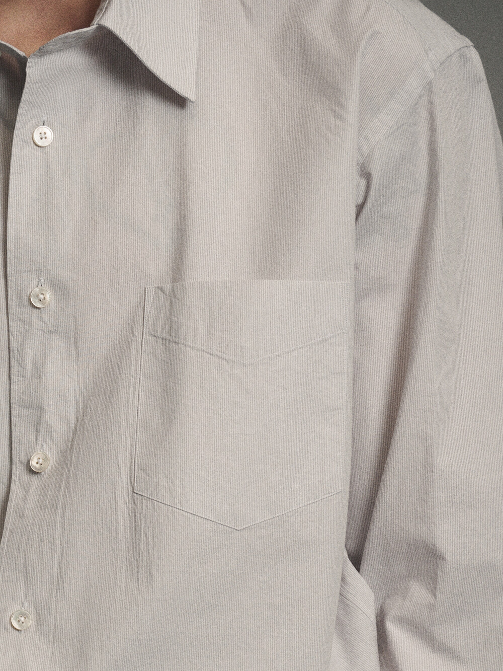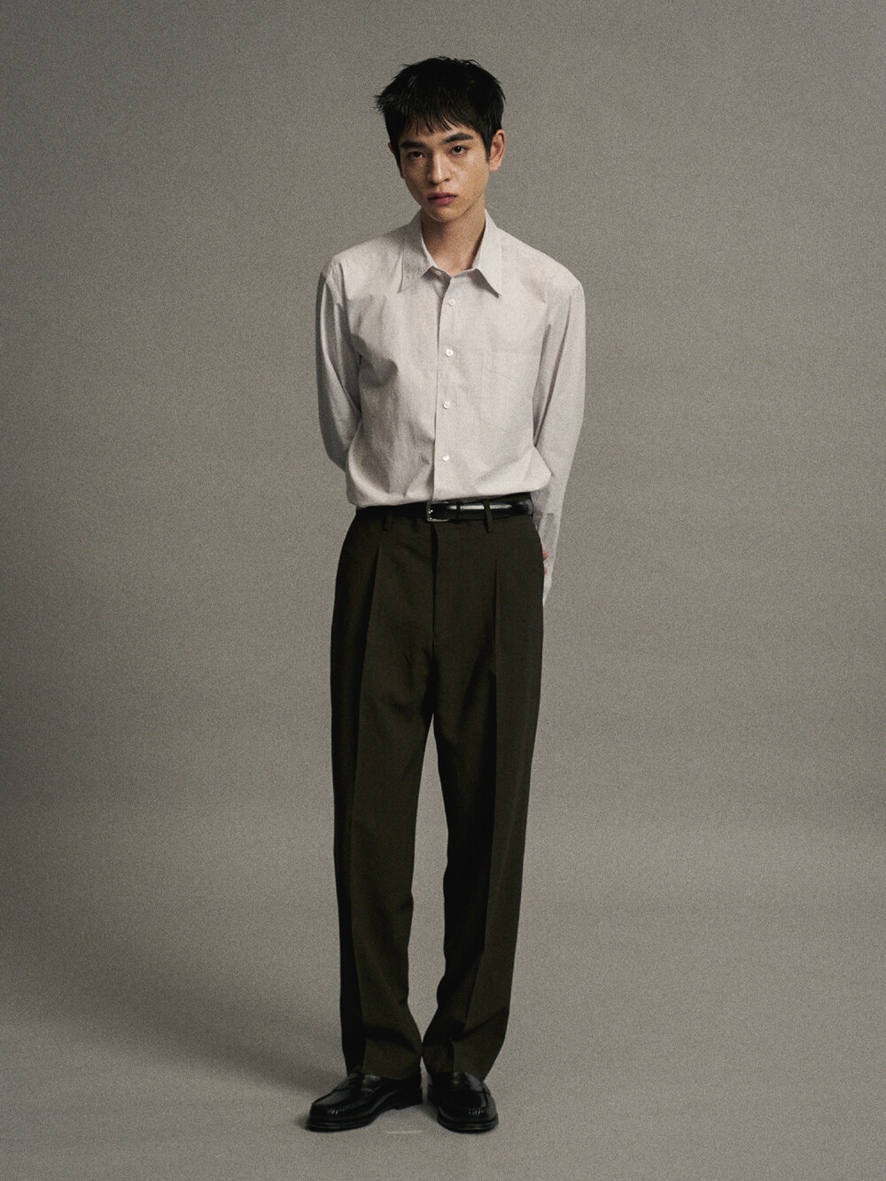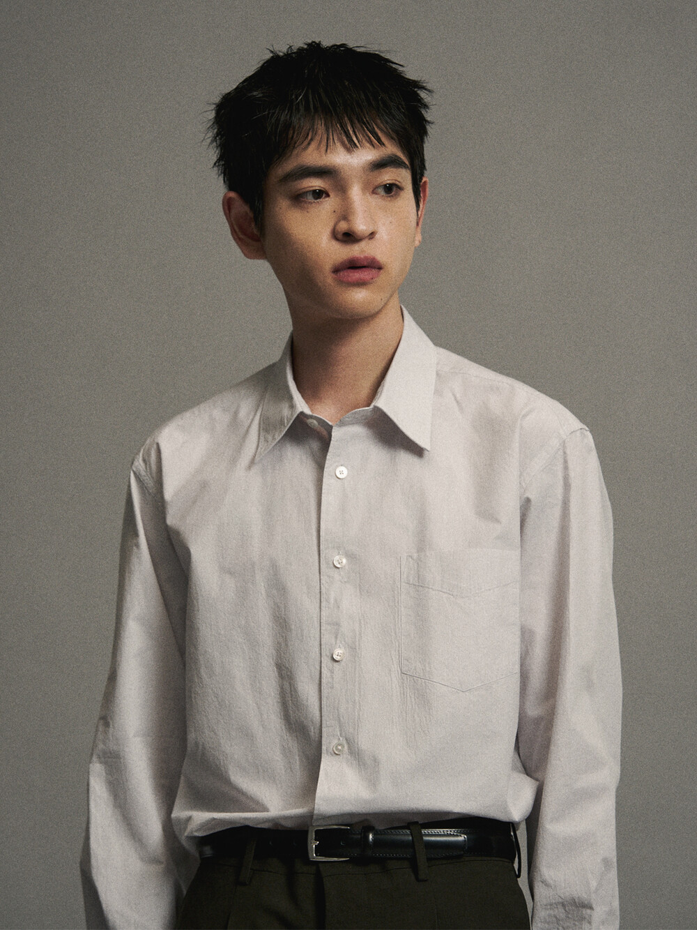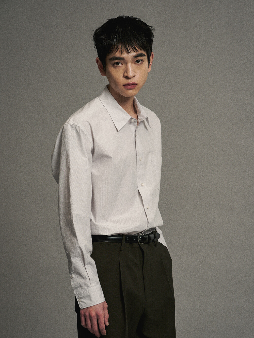 헤어라인 스트라이프 패턴의 오가닉 코튼 원단으로 만든 테이퍼드 셔츠입니다. 멀리서 보면 단색으로 보이는 미세한 간격의 스트라이프 원단입니다. 여유로운 실루엣을 살리면서도 허리라인을 조정하여 자연스럽게 넣어입을 수 있도록 만들었습니다. 미니멀하고 프로패셔널한 룩을 위하여 앞판 플라켓과 뒷판 주름을 생략하고 가슴 포켓을 추가하여 실용성을 높였습니다. 캐주얼함과 포멀함을 모두 만족시키는 셔츠입니다. 타이와 매치하기에도 좋은 디자인의 셔츠로 캐주얼 룩부터 셋업 수트까지 다양한 코디가 가능합니다.