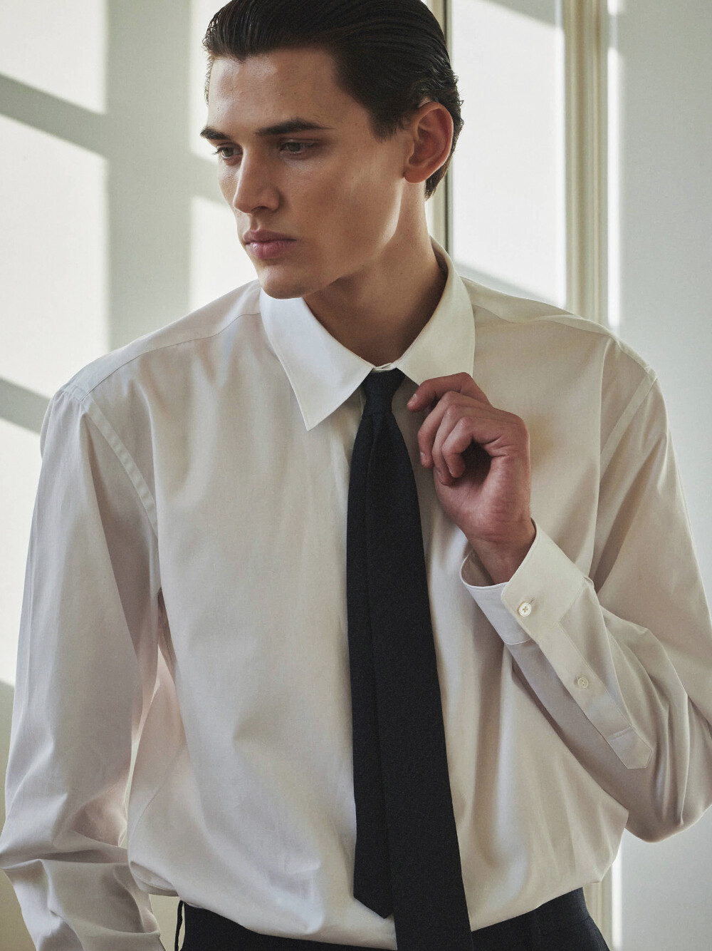 이태리 코모에 위치한 실크 전문 공장 핀토에서 만들었습니다. 세계적인 명품 브랜드와 동일한 패턴 및 봉제기법으로 제작되었습니다. 유럽의 명품 브랜드에서만 사용하는 심지를 적용하여 타이의 실루엣이 내츄럴하게 떨어지며 매듭과 딤플(Dimple)을 쉽게 잡을 수 있습니다. 타이 안쪽에는 고급 타이의 상징인 조정실을 손바느질하였습니다. 대검 뒷면의 라벨은 소검을 넣는 용도로 사용할 수 있습니다.