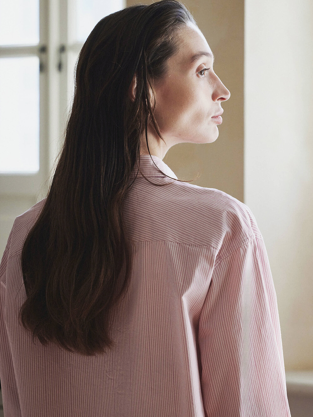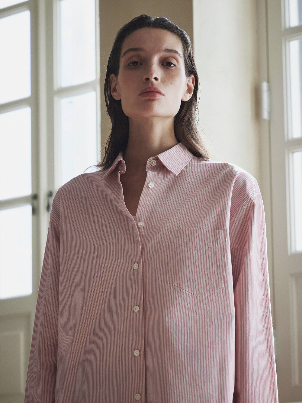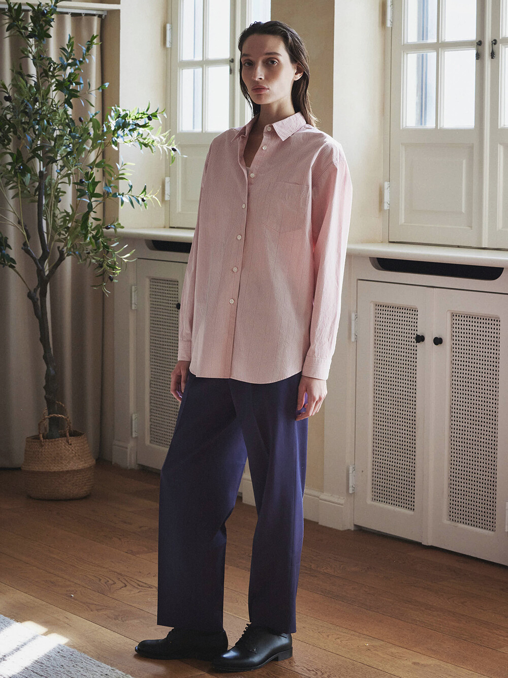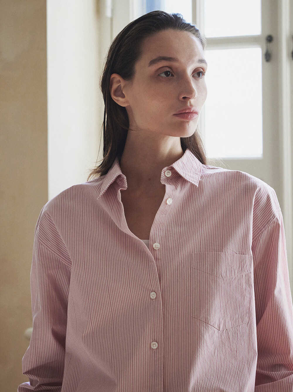 스페인 시도그라스(Sidogras)사의 스트라이프 오가닉 코튼 원단으로 만든 여성용 셔츠입니다. 앞판에 가슴포켓이 달려있으며, 뒷판 요크를 사선으로 재단하였습니다. 적당히 여유로운 실루엣의 컴포트핏 셔츠로 다양하게 연출할 수 있습니다.
