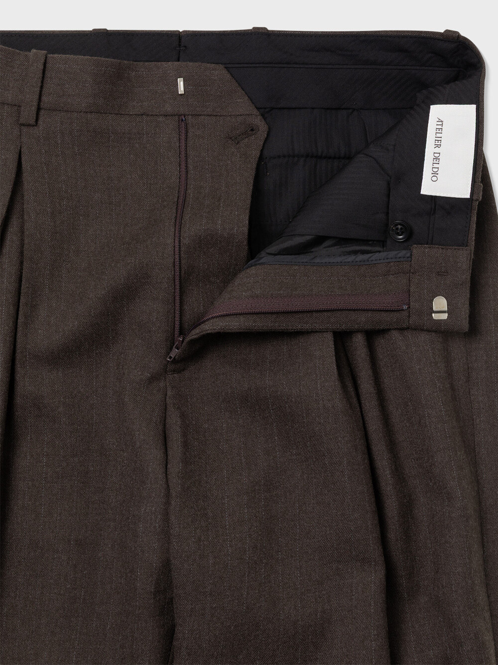 스트라이프 패턴의 플란넬 울 원단으로 만든 3턱 멀티 플리티드 팬츠입니다. 90년대 초반의 와이드 팬츠를 델디오의 테일러링 기술로 재해석하였습니다. 빈티지 아키이브를 분석하여 맞주름 옆에 주름이 하나 더 있는 3턱 디테일과 우아하게 떨어지는 핏을 완성했습니다. 절제된 여유로운 실루엣의 와이드 슬랙스로 캐주얼부터 포멀 룩까지 다양한 연출이 가능합니다.